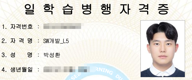 2023년에는 정보처리기사 와 일학습병행자격증(외부평가) 2가지의 자격증을 취득하였다. 2월 훈련소에서 남는 시간마다 정보처리기사를 준비하여 한 번에 필기와 실기를 붙을 수 있었고, 4년 간 정말 열심히 참여했던 일학습병행제의 외부평가에 합격할 수 있었다. 내가 하고 있는 일학습병행제는 4년간 회사 일과 대학교 수업을 병행하며 4년간의 실무 경험과 학위를 동시에 가져갈 수 있는 제도이다. 해당 제도를 통해 많은 것을 배웠지만 동시에 많은 것을 잃기도 했던 것 같다.