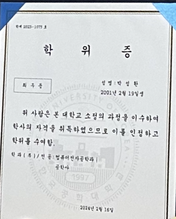 그렇게 노력한 결과, 회사에서는 개발팀 리더로 인정받았고, 학교에서는 당당히 수석 졸업이라는 결과를 얻었다. 4년이라는 시간이 길고도 힘들었지만, 그 과정에서 얻은 실무 경험과 학문적 성과는 내 커리어의 든든한 기반이 되었다.