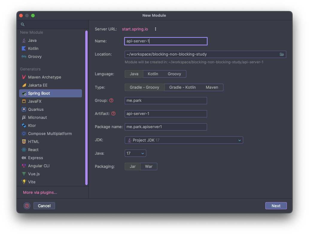 2. SpringBoot를 클릭하고 Name에 api-server-1을 입력한다. Language는 Java, Type은 Gradle-Groovy를 선택한다.